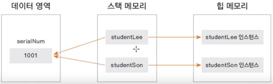 ex) Student.serialNum = 100; // serialNum이 static 변수 또는 클래스 변수라고도 한다.