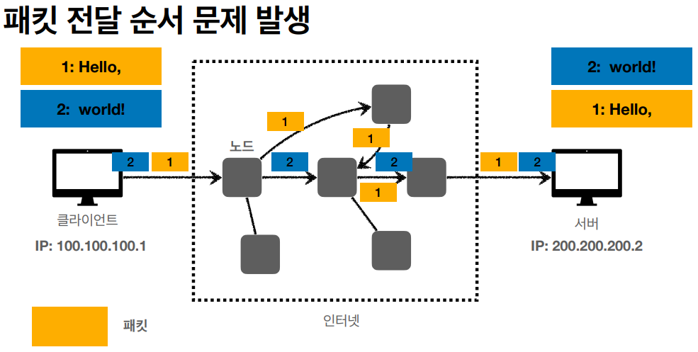 패킷 전송과 정확한 순서를 보장하려면 TCP 프로토콜과 같은 IP의 상위 프로토콜을 이용해야 한다.