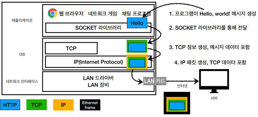 Hello world라는 메시지를 전송하면 SOKET 라이브러리를 이용해 OS계층으로 전달, OS계층에서는 메시지 데이터에 TCP 정보를 포함시키고 TCP정보를 포함하는 IP 패킷을 생성한다. IP 패킷은 네트워크 인터페이스를 통해 전송한다.